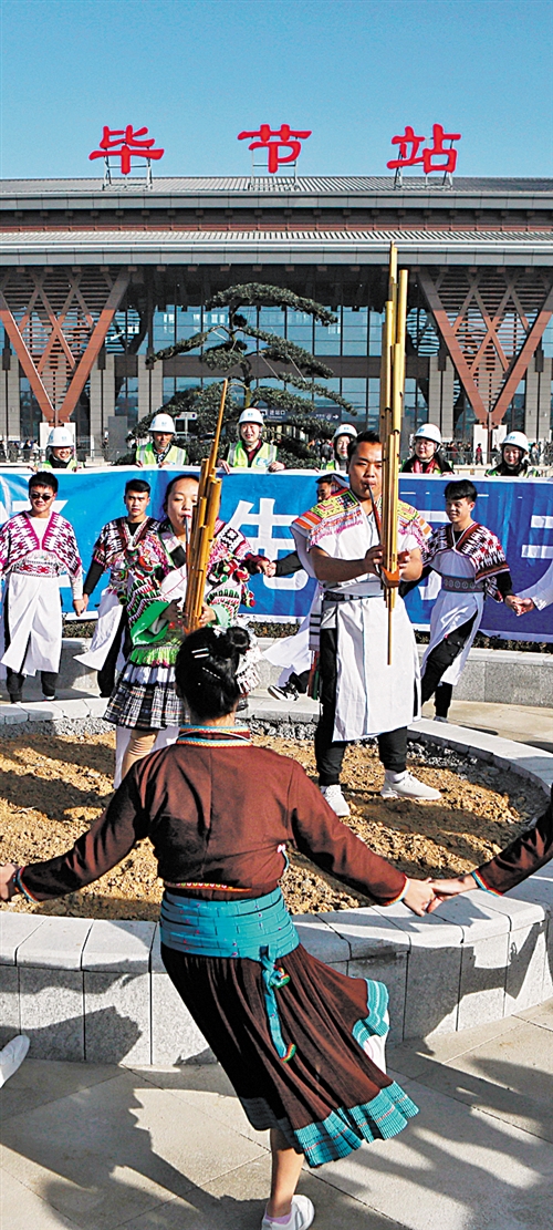 图① 少数民族同胞在成贵高铁毕节站前跳芦笙舞,庆祝成贵高铁全线通车。 欧东衢摄(新华社发)