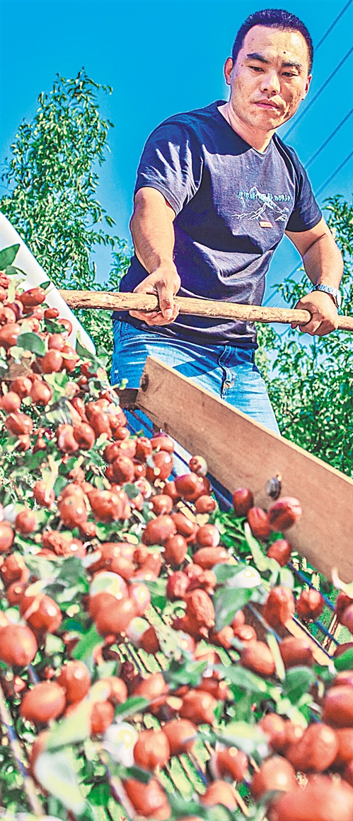 图② 河北枣强县枣强镇孟家庄村枣农在过筛红枣。枣强县发展“马莲小枣”种植2000余亩,带动1000余名农民增收致富。 新华社记者 李晓果摄