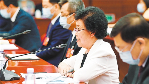 图② 人大山西代表团在驻地举行会议,全国人大代表郭凤莲正在发言。