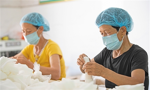 6月18日,在江西省新余市渝水区罗坊镇长陇村,扶贫对象以计件务工的形式在村里的扶贫车间务工。为帮助贫困户稳定脱贫,巩固脱贫成果,江西各级扶贫部门推动建立扶贫车间与各类工厂的代工合作,并设置公益性岗位,促进扶贫对象可在家门口务工就业,让村民可农忙下田、农闲务工。