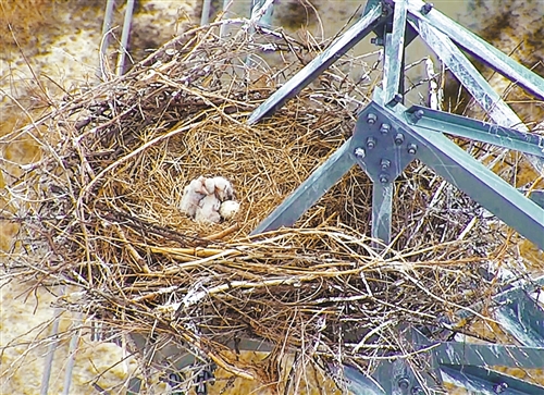 这天,国网吉林检修公司松原运维分部的工作人员在巡视检查松原至白城的一条500千伏输电线路时,发现该线路位于长岭县的一个输电线路铁塔上,有一个东方白鹳的鸟巢。一对东方白鹳“夫妇”在这里修筑了鸟巢并安家落户。鸟巢筑在铁塔的地线支架处,离地面大约有60米高。它们在这里成功地繁育出了3只幼鸟。