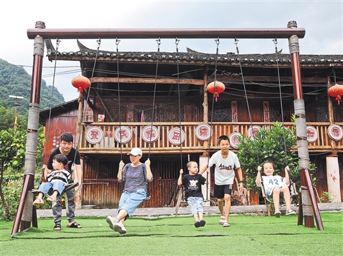8月16日,游客在重庆市黔江区小南海镇新建村土家十三寨游玩。新建村群峰叠嶂、溪水蜿蜒,树密竹茂,生态优美,生活着200多户1000多名土家族人。村民至今仍居住在土家族特有的吊脚楼,并保持着土家族独特的风俗习惯。2014年,新建村成为首批中国少数民族特色村寨。日前又被列为第二批全国乡村旅游重点村。近年来,黔江区利用新建村秀美的山水和传统民俗,打造最美乡村和民族风情村,吸引了越来越多的游客前来观光旅游,让这里的村民吃上旅游饭,走上致富路。 杨 敏摄(中经视觉)