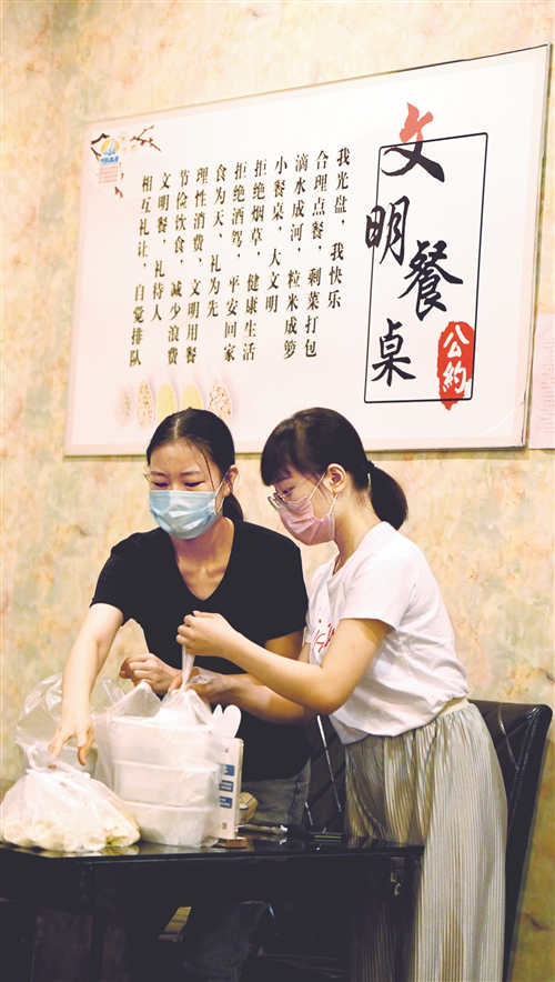 顾客在河北省石家庄市裕华区一家餐饮企业打包饭菜。近日,河北省一些餐饮企业开展“‘光盘行动’拒绝餐饮浪费”宣传活动,号召消费者用实际行动加入到“光盘行动”中,杜绝“舌尖上的浪费”,让厉行节约成为一种习惯。