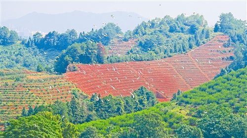 9月5日,白鹭在江西省安远县新龙乡脐橙基地嬉戏。近年来,安远县大力践行“绿水青山就是金山银山”理念,积极发展生态产业,释放生态红利,促进绿色产业高质量发展。目前,该县30多万亩橙园集群年产值达13亿元。