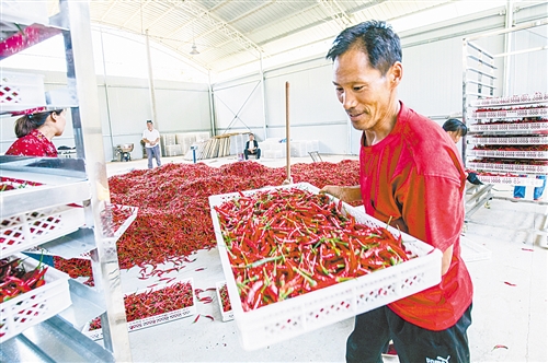 9月2日,河南省三门峡市卢氏县木桐乡河口村,贫困户在辣椒加工厂烘干辣椒。目前,三门峡市种植的40多万亩辣椒正在收获,为巩固脱贫成效提供了坚实的产业支撑。程专艺摄(中经视觉)