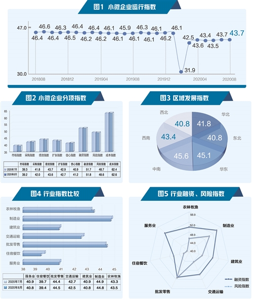 2020年8月份,“经济日报—中国邮政储蓄银行小微企业运行指数”(见图1)为43.7,与上月持平。