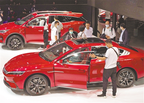 右图 9月26日,第十六届北京国际汽车展览会开幕,观众在比亚迪展台前体验新款汽车。
