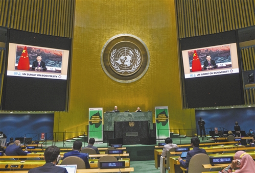 习近平强调,中国用生态文明理念指导发展,把生态文明建设放在突出地位,采取有力政策行动。过去10年,森林资源增长面积超过7000万公顷,居全球首位。长时间、大规模治理沙化、荒漠化,有效保护修复湿地,生物遗传资源收集保藏量位居世界前列。90%的陆地生态系统类型和85%的重点野生动物种群得到有效保护。中国积极参与全球环境治理,切实履行气候变化、生物多样性等环境相关条约义务,已提前完成2020年应对气候变化和设立自然保护区相关目标。中国将秉持人类命运共同体理念,愿承担与中国发展水平相称的国际责任,提高国家自主贡献力度,采取更加有力的政策和措施,二氧化碳排放力争于2030年前达到峰值,努力争取2060年前实现碳中和,为实现应对气候变化《巴黎协定》确定的目标作出更大努力和贡献。