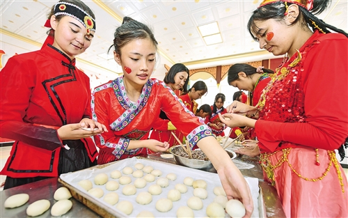 10月1日,在浙江湖州市长兴职教中心新疆民族餐厅,新疆班、云贵班学生在老师的指导下制作月饼。当日,长兴县职业技术教育中心学校举行主题活动,弘扬中华民族优秀传统文化,欢度国庆节和中秋节。谭云俸摄(中经视觉)