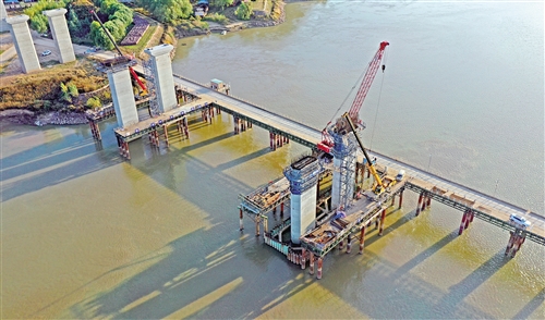 11月2日,位于河南孟州市辖区黄河河道的“国道207孟州至偃师黄河公路大桥及连接线工程”施工现场,中交一公局集团建设者在紧张施工。该工程是国家公路网重点项目、河南省“十三五”重点工程,项目总投资23.62亿元,预计2021年年底建成通车。白水平摄(中经视觉)
