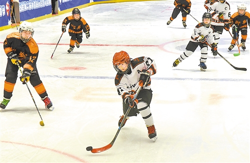 11月22日,小运动员们在参加冰球比赛。当日,河北省邯郸市丛台区举行第二届冰雪运动会暨大众冰雪节活动,600多名运动员参加轮滑、陆地冰壶、冰球等项目角逐,感受冰雪运动魅力。 郝群英摄(中经视觉)