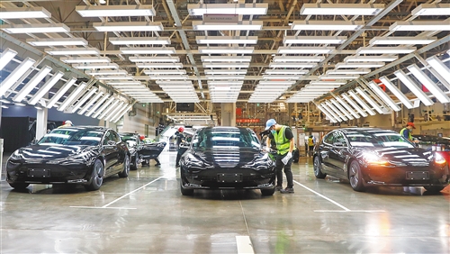图为工作人员在特斯拉上海超级工厂内作业。新华社记者 丁 汀摄