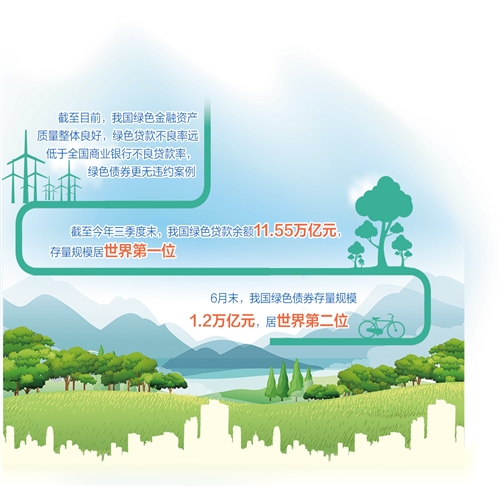 截至目前,我国绿色金融资产质量整体良好,绿色贷款不良率远低于全国商业银行不良贷款率,绿色债券更无违约案例。数据显示,截至今年三季度末,我国绿色贷款余额11.55万亿元,存量规模居世界第一位;6月末,绿色债券存量规模1.2万亿元,居世界第二位。
