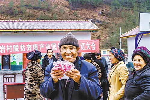 12月14日,四川凉山州越西县板桥乡大岩村脱贫奔康产业园举行分红大会,59户脱贫户分别领到了500元分红款,还为村集体经济增加收入3万余元。曾才刚摄(中经视觉)