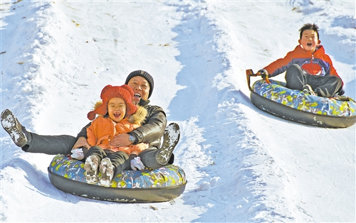 近日,在山东省烟台市南里必捷滑雪公园,家长带着小朋友体验雪圈滑雪。隆冬季节,山东省烟台市各滑雪场迎来大批滑雪爱好者。人们在冬日暖阳下尽情玩耍,享受冰雪运动带来的乐趣。孙文潭摄(中经视觉)