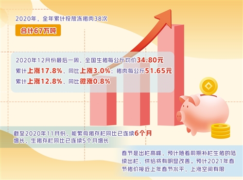 对1月8日生猪期货正式挂牌交易以后全国猪价的走势,朱增勇认为可从供需两方面进行分析。从消费看,春节是传统消费旺季,但2020年12月份以来猪价上涨抑制了部分消费需求。从供给看,截至2020年11月份,能繁母猪存栏同比已连续6个月增长,生猪存栏同比已连续5个月增长。春节是出栏高峰,预计随着前期补栏生猪的陆续出栏,供给将有明显改善。综合判断,预计2021年春节猪价接近上年春节水平,上涨空间有限。