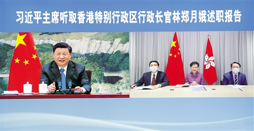 习近平说,因为疫情防控需要,这次采取视频连线方式听取你对2020年工作的述职报告。我首先向香港特别行政区全体居民表示诚挚的慰问。新冠肺炎疫情已经持续一年多,给世界带来严重冲击。香港作为高度开放的国际性城市,所受影响比较大。前一段时间,香港暴发第四波疫情,对市民生命安全和身体健康造成较大威胁,也给大家工作生活造成许多困扰。我很关心、很担忧。中央政府已经并将继续采取一切必要措施,全力支持香港特别行政区抗击疫情。大家要坚定信心、团结抗疫。祖国永远是香港的坚强后盾,眼前的困难一定能够战胜。