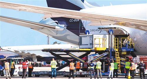 1月28日,在智利圣地亚哥国际机场,工作人员从飞机上卸下装有中国新冠疫苗的温控集装箱。