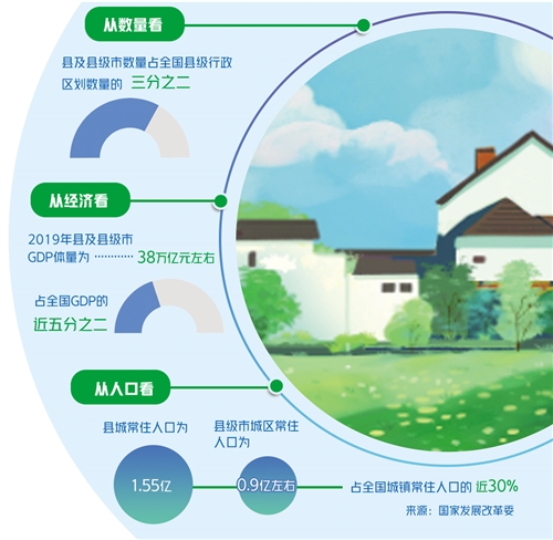 县域经济是国民经济的重要基石和支柱。改革开放40多年,我国县域经济发展取得显著成就。据国家发展改革委数据,2019年县及县级市GDP体量为38万亿元左右,占全国GDP的近五分之二。其中,作为县域经济核心的县城及县级市城区GDP占全国GDP的近四分之一。人口城镇化率明显提高,县城人口承载能力显著提升。2019年底,县城和县级市城区常住人口分别为1.55亿、0.9亿人左右,共计2.4亿人左右,占全国城镇常住人口的近30%。
