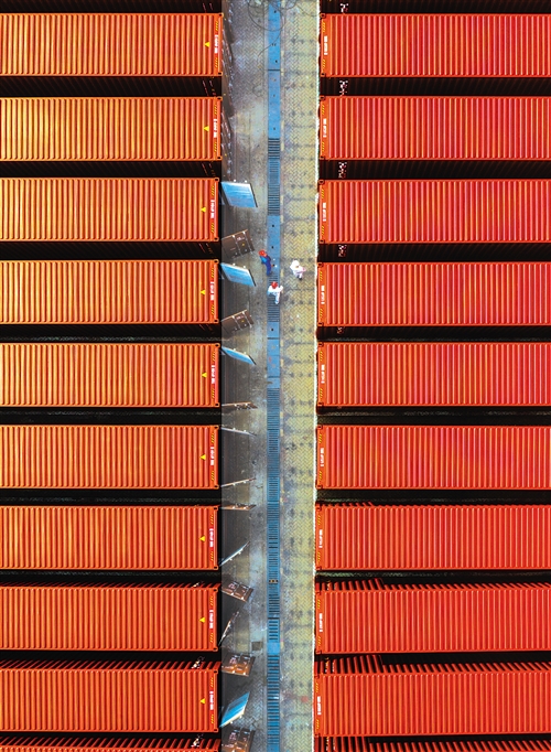 2月2日,在广东省广州市南沙区万顷沙镇东方国际集装箱(广州)有限公司内,员工在为集装箱喷涂、检测、装船。今年以来,集装箱市场需求大增,该公司抢抓市场机遇赶订单,业绩稳步增长。邱新生摄(中经视觉)