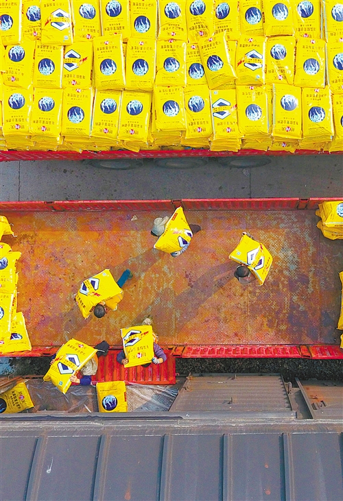 右图 2月4日,江西省九江市里瑞昌车站员工在装卸将发往云南昭通、四川燕岗等地的春耕支农复合肥。