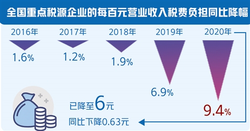 更大规模减税降费助力企业轻装上阵。调研显示,企业成本费用在2020年呈现先升后降的走势。以“规模以上工业企业每百元营收成本费用”为例,该指标在3月达到高位后迎来拐点,整体呈现“倒V”走势。其中,企业税费负担在2020年出现了大幅下降,全国重点税源企业的每百元营业收入税费负担已降至6元,同比下降0.63元,降幅达9.4%,远大于2016年至2019年1.6%、1.2%、1.9%和6.9%的同比降幅。