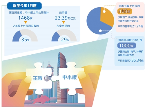 截至1月底,深交所主板、中小板上市公司合计1468家,占A股上市公司总数的35%,总市值23.39万亿元,占全市场的29%。