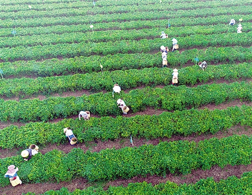 2月7日,茶农在海南省白沙黎族自治县五里路茶叶专业合作社的有机茶园采茶。近日,当地有机茶园迎来春茶采摘期,茶农抢抓农时采摘茶叶。