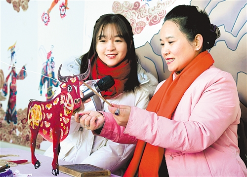 上图 京西皮影传承人王熙(右)与视频主播向网友介绍牛年主题皮影。 下图 2月3日在中国京西皮影非遗园拍摄的皮影表演。