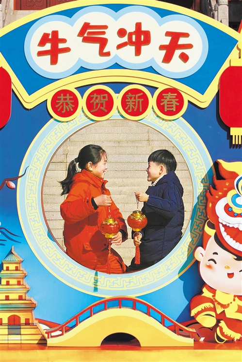| 2月9日,江苏省泰州市小朋友在望海楼前戏耍。古城泰州喜气洋洋,年味十足。 汤德宏摄 |