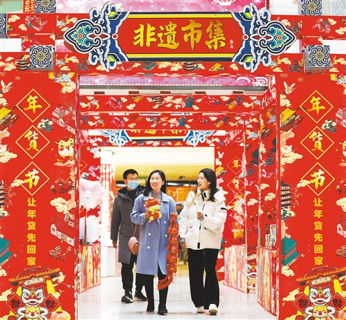 | 2月10日,河北省迁安市游客正在“非遗年味市集”上购物赏景。春节临近,迁安市“非遗年味市集”汇集了丰富多彩的非遗文化项目和民俗文化展,为市民送上丰富的“年味大餐”。蔡常颖摄 |