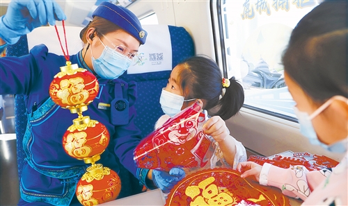 2月13日,呼和浩特铁路局集团公司包头客运段高铁车队乘务员何欣与乘客在列车上一起过年。春节期间,该高铁车队的乘务员们坚守岗位,提供全面服务,营造浓浓年味。