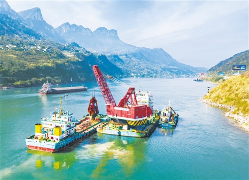 春节期间,位于长江三峡大坝至葛洲坝之间的湖北省宜昌市夷陵区乐天溪镇莲沱段航道整治工程项目加紧施工。竣工后,三峡“两坝”间的水域将更加通畅安全。郑家裕摄