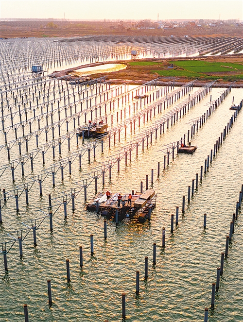 2月23日,安徽省合肥市肥东县杨店乡大李水库渔光互补光伏电站项目施工现场一派繁忙,工人在浮船上安装光伏板支架。阮雪枫摄(中经视觉)