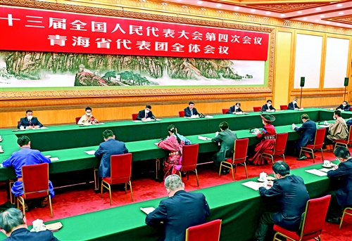 在认真听取代表发言后,习近平作了讲话。习近平充分肯定青海一年来工作和“十三五”时期发展,希望青海的同志全面贯彻落实党中央决策部署,完整、准确、全面贯彻新发展理念,坚持以人民为中心,坚持稳中求进工作总基调,持续深化改革开放,统筹发展和安全,弘扬光荣传统和奋斗精神,把坚持生态优先、推动高质量发展、创造高品质生活部署落到实处,在推动青藏高原生态保护和可持续发展上不断取得新成就,书写新时代青海新篇章。