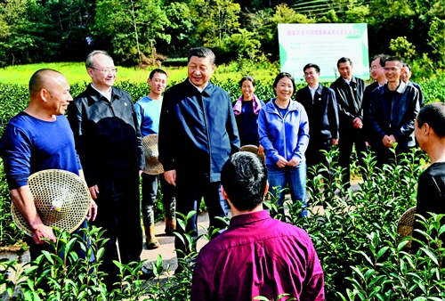武夷山是乌龙茶、红茶的发源地。习近平来到星村镇燕子窠生态茶园,察看春茶长势,了解当地茶产业发展情况。习近平强调,要统筹做好茶文化、茶产业、茶科技这篇大文章,坚持绿色发展方向,强化品牌意识,优化营销流通环境,打牢乡村振兴的产业基础。要深入推进科技特派员制度,让广大科技特派员把论文写在田野大地上。