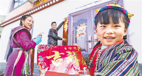 ▼2月11日,在西藏林芝市墨脱县,张淳焕一家三口人在家门前贴对联。 “高原孤岛”的民族团结年 (组图之一) 作 者 孙 非 |