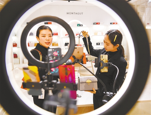 直播唱主角 交易额170亿 (组图之一) 作 者 冯 云 ▲2月5日,河北省白沟新城和道国际箱包城春丽皮具店,员工关梦娟(左)正在直播销售当地生产的自主品牌箱包。 |
