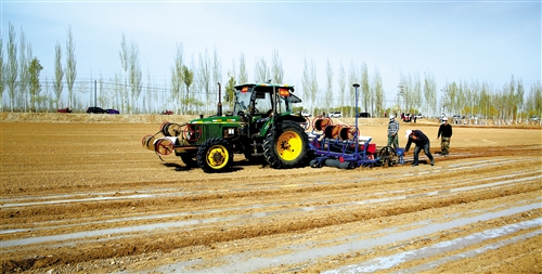 3月29日,北斗卫星导航无人驾驶拖拉机在新疆温宿县古勒阿瓦提乡古勒阿瓦提村棉田里播种新棉。今年温宿县计划播种新棉47万亩。