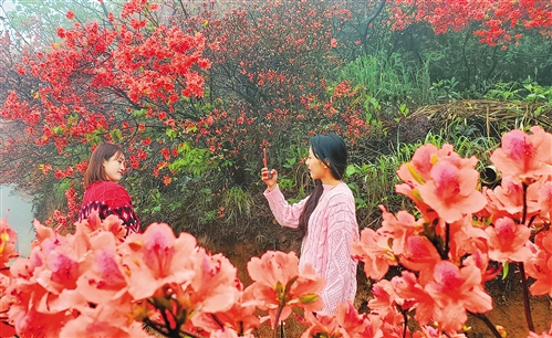路边的桃花林中,游客们纷纷拍照留念。乡间小路上,尽是游人欢愉的身影;河流小溪间,旅友们伴着潺潺水声吟诗作赋;湖水泛起阵阵涟漪,一叶叶扁舟正将水面点缀得多姿多彩。