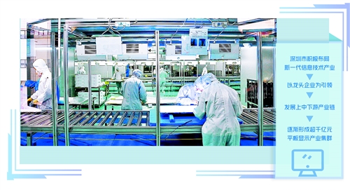 世界显示有中国,中国显示看深圳。以龙头企业为引领,深圳新型显示企业实现智能化、高效化发展,推动产业由小变大、由弱变强,形成集显示面板、玻璃基板、彩色滤光片、偏光片、LED光源、电视、商业显示终端等组成的上中下游产业链,逐渐形成超千亿元平板显示产业集群。