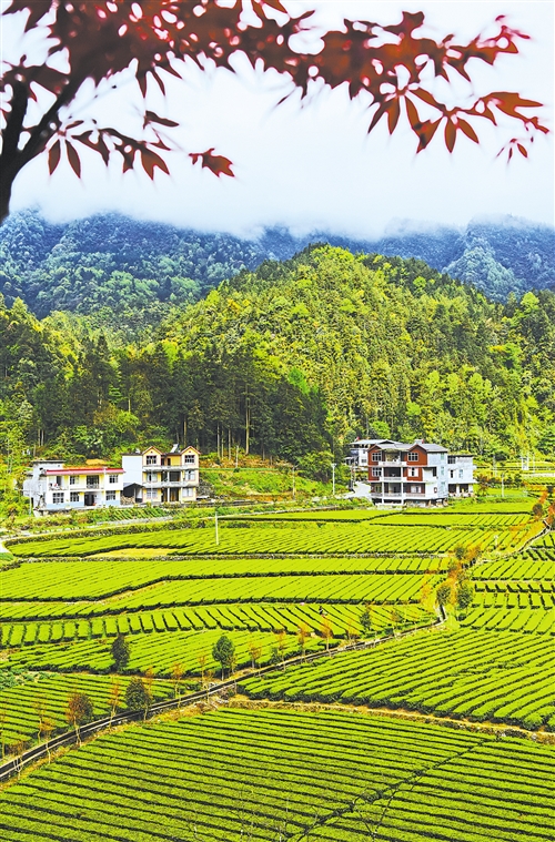 4月15日,湖北省咸丰县黄金洞乡大沙坝村,嫩绿的茶园与远山、红叶、民居交相辉映,构成一幅乡村振兴的生态画卷。