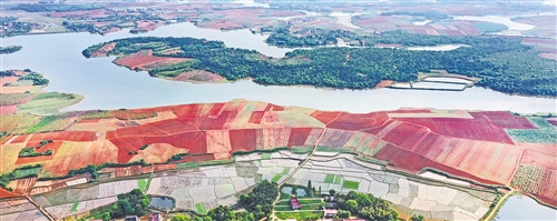 暮春时节,樟树市义成镇2.8万亩红土地里种上了成片的经济作物。红色的土地、湛蓝的湖水和绿油油的药材苗木,构成了一幅壮美的乡村新画卷。
