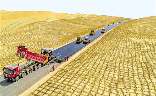 4月27日,新疆塔克拉玛干沙漠腹地尉且公路K157处一工区施工现场,摊铺机、压路机等大型机械正有序地进行沥青面层施工。据了解,尉犁至且末沙漠公路是第三条穿越塔克拉玛干沙漠的公路,全长约334公里,建成通车后,且末到库尔勒的行车时间将由原来的12小时缩短为6小时。