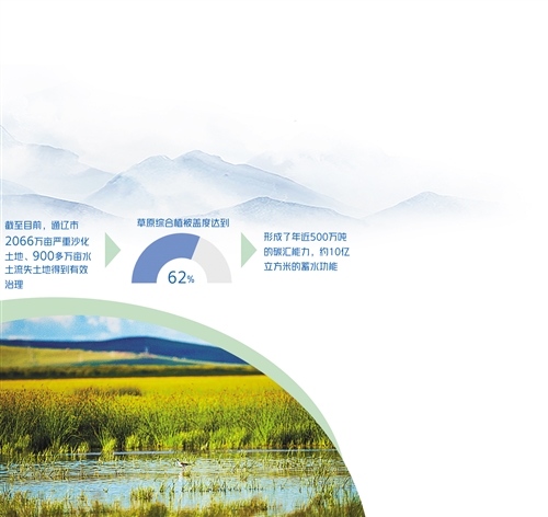 “我们在多年防沙治沙生产实践中,确定了‘乔灌草相结合,以灌草为主;造封飞相结合,以封为主’的生态治理方针。总结推广了生物经济圈、植物再生沙障、沙漠锁边林等多种综合治沙模式。还大力发展节水高效林业,不断提高防沙治沙质量和成效。”通辽市林业和草原局副局长包宝君说。在开展治沙造林的同时,通辽市不断加大草原建设力度,促进草原修复,通过采取封禁保护、自然封育等措施,累计修复草原600万亩。