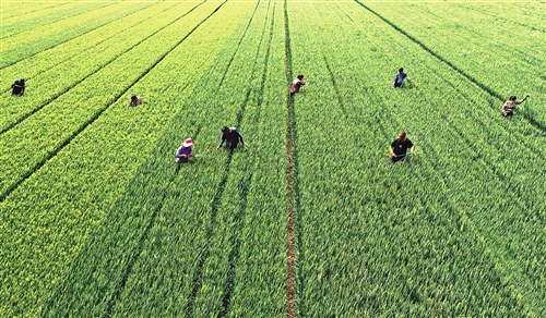 5月11日,河南省尉氏县邢庄乡芦馆村农民在高标准小麦示范田劳作。当前,豫东地区小麦进入抽穗扬花期,尉氏县组织近百名农业技术人员深入田间地头,现场指导小麦管理和病虫害防治,目前该县104万亩小麦长势喜人。 李新义摄(中经视觉)