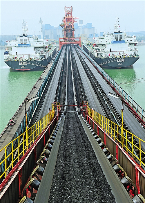 7月7日,两艘运送电煤的船舶在黄骅港装运电煤。我国电煤南运重要输出港河北沧州市黄骅港,今年上半年输出电煤10997.1万吨,同比增加21.3%,创历史同期最高水平。傅新春摄(中经视觉)