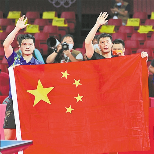 图② 在乒乓球男子单打决赛中,马龙(右)战胜队友樊振东摘金。新华社记者 王东震摄