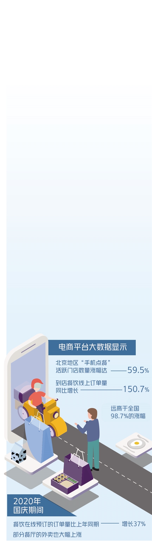 重创之下的餐饮业能表现出强劲的复苏态势正是源于此。2020年国庆期间,餐饮在线预订的订单量比上年同期增长37%,部分餐厅的外卖也大幅上涨。比如,北京同和居3家门店去年国庆期间外卖收入同比增长超700%,华天二友居同比增长超100%。国家统计局发布的数据也充分印证了这一点。2020年10月,餐饮收入4372亿元,同比增长0.8%,增速年内首次转正。