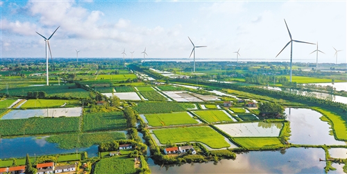 8月8日,江苏淮安金湖县塔集镇5万千瓦装机容量的九洲新能源风力发电站一角。金湖县利用丰富的河、湖、滩涂资源,科学发展新能源,一水两用,一滩多用,实现资源效益叠加。